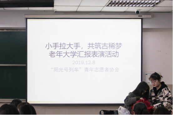 活动伊始,几个志愿者带来舞蹈《Adios》,音乐激昂向上,瞬间点燃了全场气氛。接着潘佳曦演唱歌曲《All of me》,悠扬的歌声沁入心扉,令人心旷神怡。接下来的独舞《Lalalaly》同样令大家拍手称好。舞蹈告一段落,阳光号列车全体成员合唱歌曲《七月上》,观众们都陶醉其中。志愿者唐智炜也为大家带来了《脸》,大家静静聆听着美妙的歌声。接下来,老年大学全体成员携志愿者合唱了歌曲《Take me home, Country roads》,老人们和志愿者们共享其乐。最后一个节目是阳光号列车成员的弹唱《我相信》,我相信明天,我相信希望。相信阳光号列车,在志愿服务的路上,能够越走越远,越来越壮大,播撒阳光。