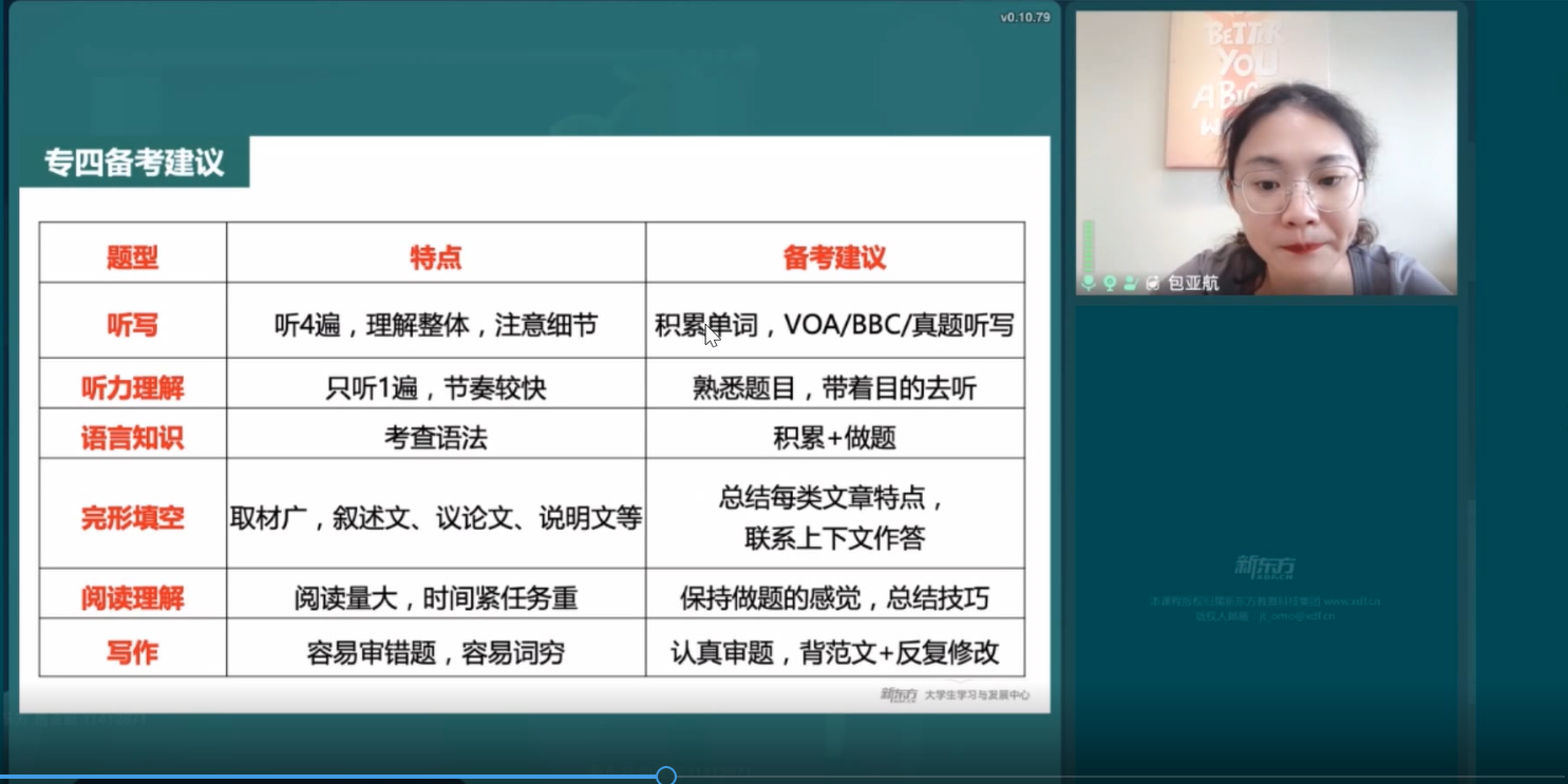 为进一步加强大学生职业生涯规划能力,必赢bwin线路检测中心于9月29日下午举办“大学生职业生涯规划”讲座,讲座以线上直播的形式进行。本次讲座由新东方老师担任主讲人,必赢bwin线路检测中心2022级全体新生和部分21级学生参加。本次讲座是我院入学教育中“学业(职业)启蒙与规划教育(学在外院)”中的重要安排之一。